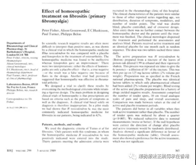 《柳葉刀》(又名《刺針》)(TheLancet),1986 年有關以順勢療法有效處理鼻敏感的研究:Reilly D, Taylor M, McSharry C, et al., Is homoeopathy a placebo response? controlled trial of homoeopathic potency, with pollen in hayfever as model," Lancet, October 18, 1986, ii: 881-6.