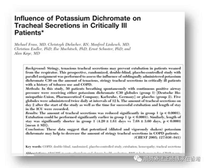 50 個以持續正壓通氣CPAP自行呼吸、患有慢性阻塞性肺病的加護病房病人,分兩組,分別服用重鉻酸鉀 30C或安慰劑,早晚各五粒,每12小時服用一次。結果顯示: